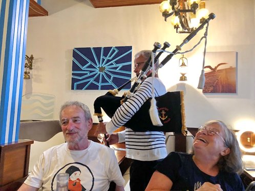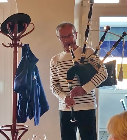 Un apéritif nous a été servi par le patron, accompagné par un joueur de biniou (ancien musicien de LANN BIHOUE). Le mot biniou désigne en breton une cornemuse.